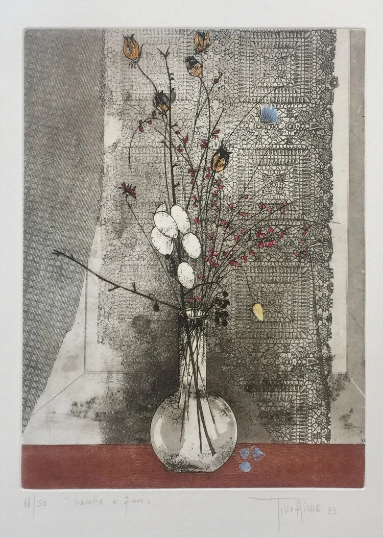 Tino Aime started exhibiting in 1963 and earned awards in Italy, France, Romania and the United States. In Provence has engraved and painted the world of Frederic Mistral: the works have been exhibited in a traveling exhibition in museums Gap, Marseille, Digne, Draguignan, Aix en Provence and Nice. Since 1983 his works are featured on the prestigious Prandi catalog of Reggio Emilia. In 1997, the Province of Turin has produced a calendar devoted entirely to the Aime’s engravings. He has made the sketch for the stamp commemorating Galileo Ferraris issued February 7, 1997. The Piedmont Region has dedicated a staff in 1992 in the Palazzo della Regione in Turin. In 1997 he created the painting for the Palio di Susa and the sketch for the lottery ticket Italy Susa-Moncenisio.